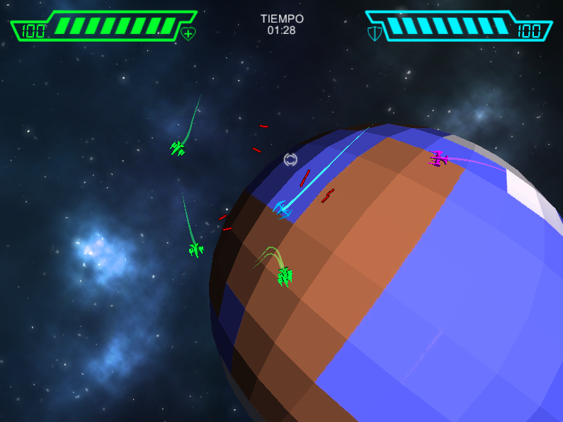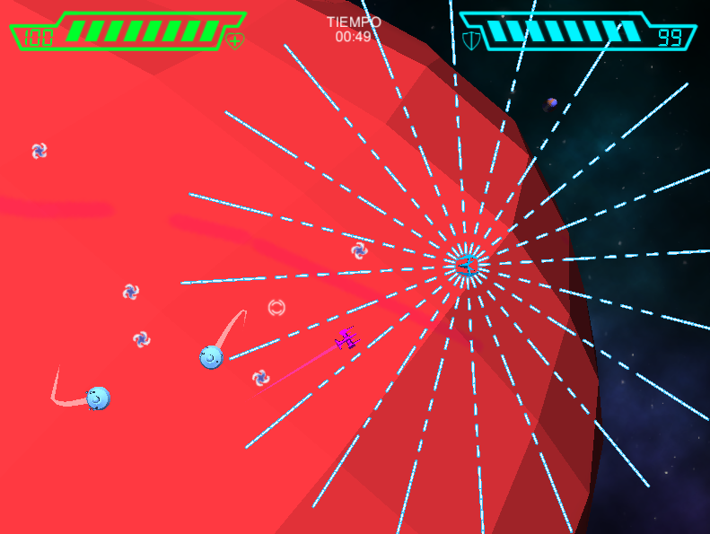 Bullets have properties of duration, damage, direction and speed. More complex bullets have secondary spawning bullets on life events, force over time and piercing capabilities.